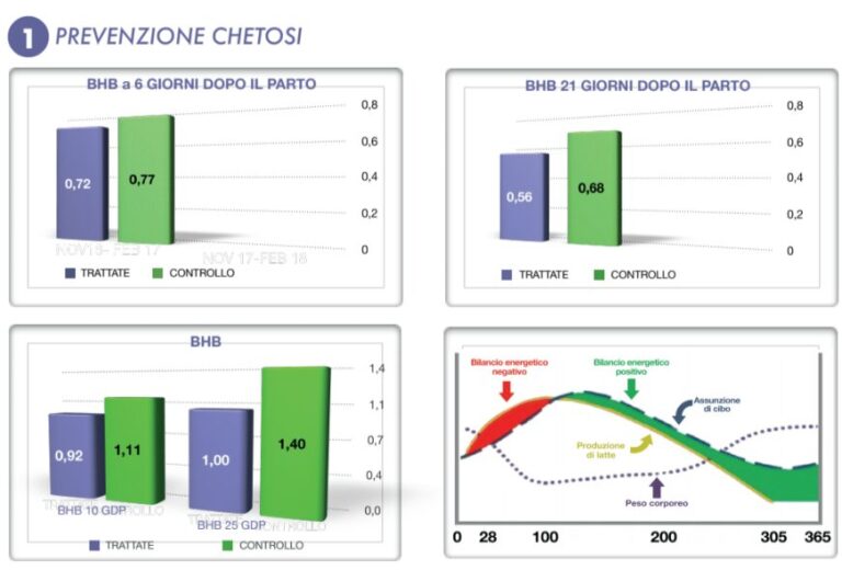 1. PREVENZIONE CHETOSI: test eseguiti a 7-14-21 giorni dopo il parto in cui è stato valutato il livello di BHB, ha evidenziato come nelle vacche trattate i livelli di BHB siano più bassi rispetto al controllo