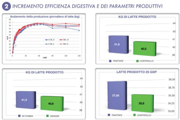 2. INCREMENTO DELL’EFFICIENZA DIGESTIVA E DEI PARAMETRI PRODUTTIVI: dalla valutazione dell’andamento della produzione giornaliera di latte il gruppo trattato ha evidenziato una produttività maggiore rispetto al controllo